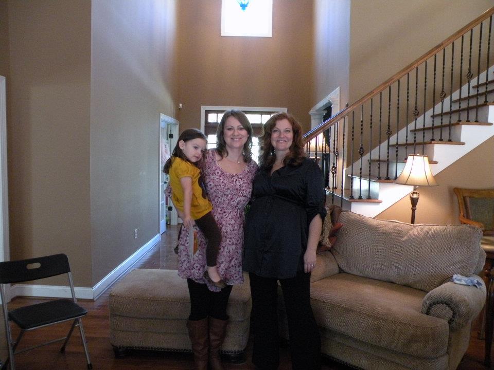 | Melissa, Laura, me and Meghann at our craft night. We are holding the wreath that we sent to Rebecca. |